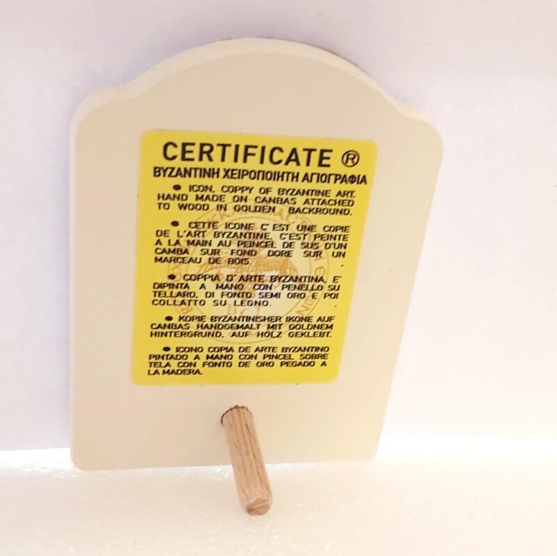 Μικρή εικόνα αγιογραφία με πλαίσιο από ασήμι και ξύλινη βάση σε μπεζ χρώμα.