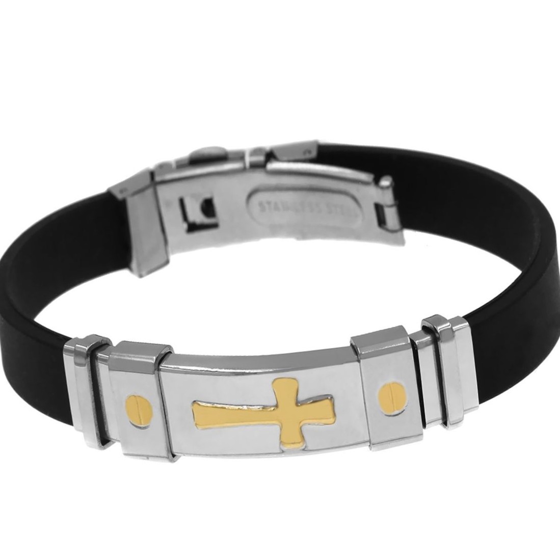 Μοντέρνο βραχιόλι, με μαύρο καουτσούκ και μεταλλική πλάκα από ανοξείδωτο ατσάλι με σταυρό, σε χρυσό χρώμα.