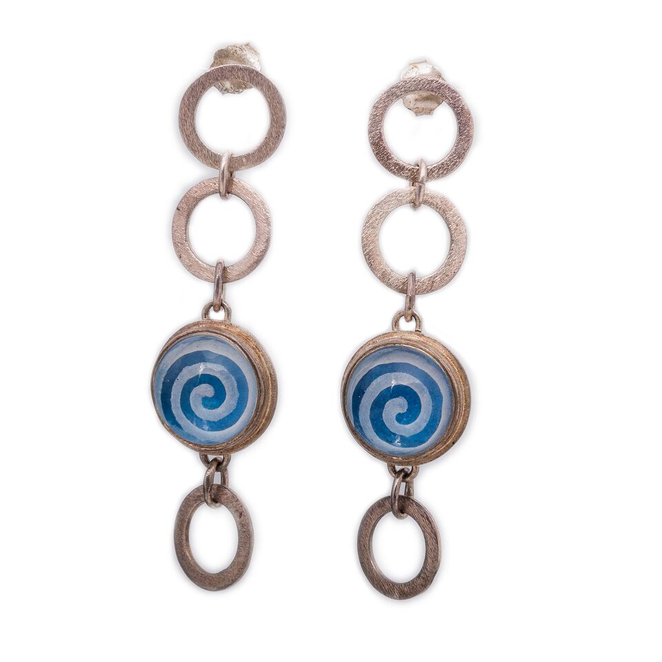 Ασημένια κρεμαστά σκουλαρίκια, με ορυκτό χαλαζία, σκαλισμένο σε σχήμα σπείρας.