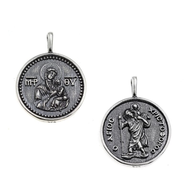 Μενταγιόν διπλής όψης, με τον Άγιο Χριστόφορο και την Παναγία, από ασήμι 925 οξειδωμένο.