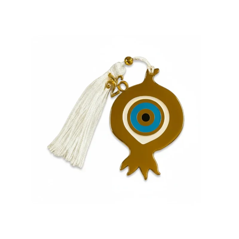 Γούρι με μεταλλικό ρόδι και με μάτι με σμάλτο. Στη φούντα κρέμεται μεταλλικό μοτίφ 26.
