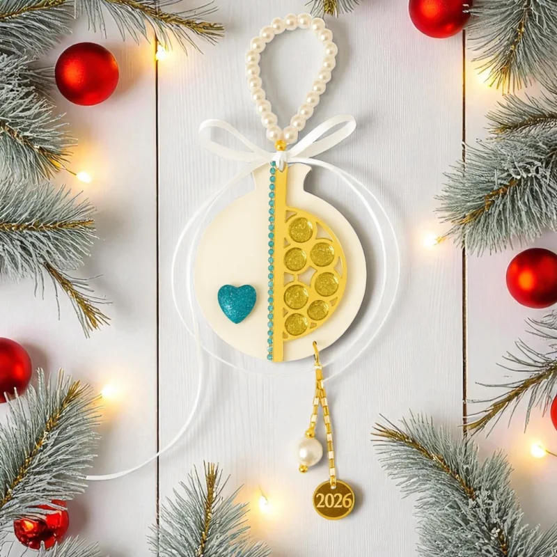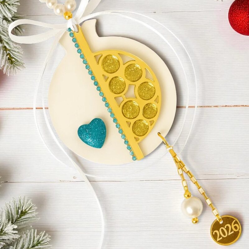 Το γούρι διακοσμούν εντυπωσιακές πέρλες και σατέν φιόγκοι καθώς και μοτίφ με το 2026.