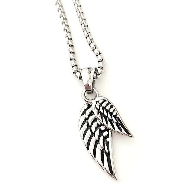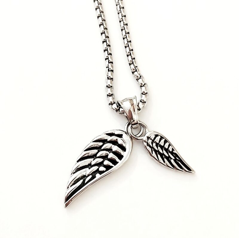 Μοντέρνο μενταγιόν unisex από ανοξείδωτο ατσάλι με φτερά σε ασημί χρώμα, συνδυασμένο με αλυσίδα ατσάλι.