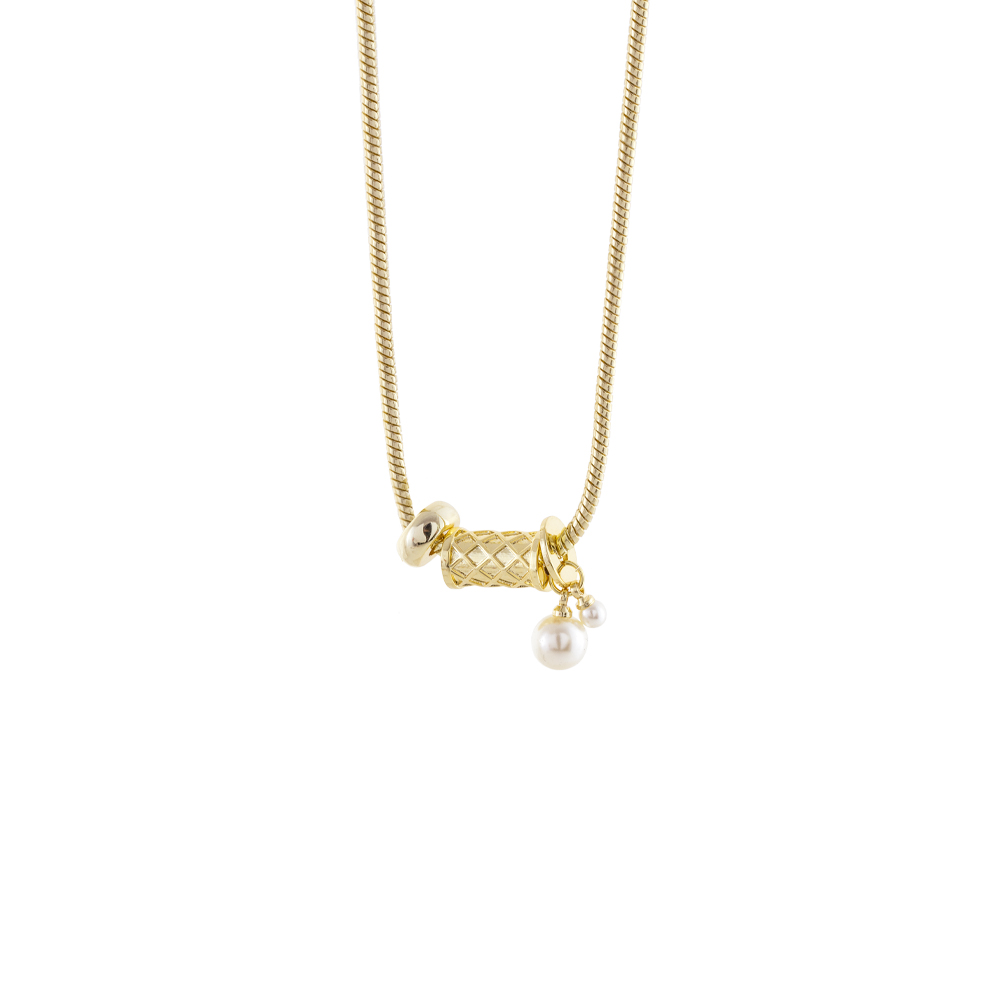 Μονέρνο κολιέ με επίχρυση αλυσίδα και charms σε συνδυασμό με λευκές πέρλες.