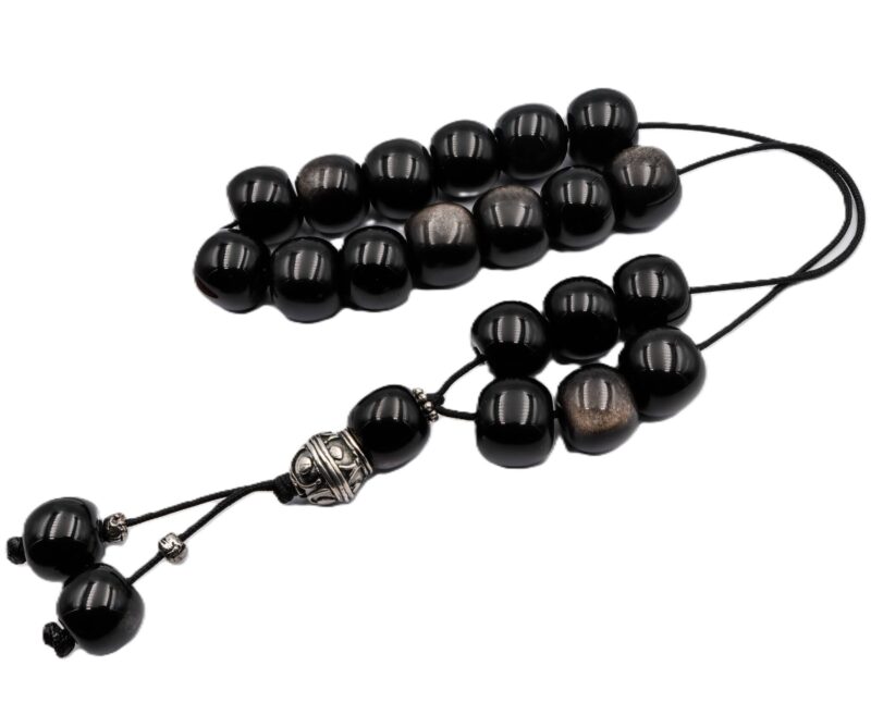 Χειροποίητο κομπολόι με ορυκτές χάντρες από μαύρο Οψιδιανό, με ασημένια στοιχεία.