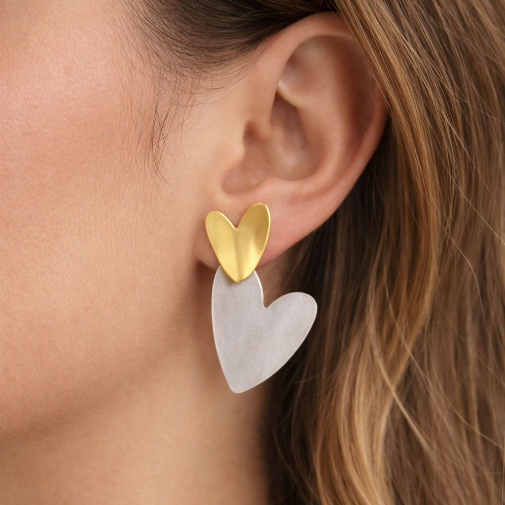 Μοντέρνα σκουλαρίκια κρεμαστά με καρδιές, από ανοξείδωτο ατσάλι, σε ασημί και χρυσό χρώμα.