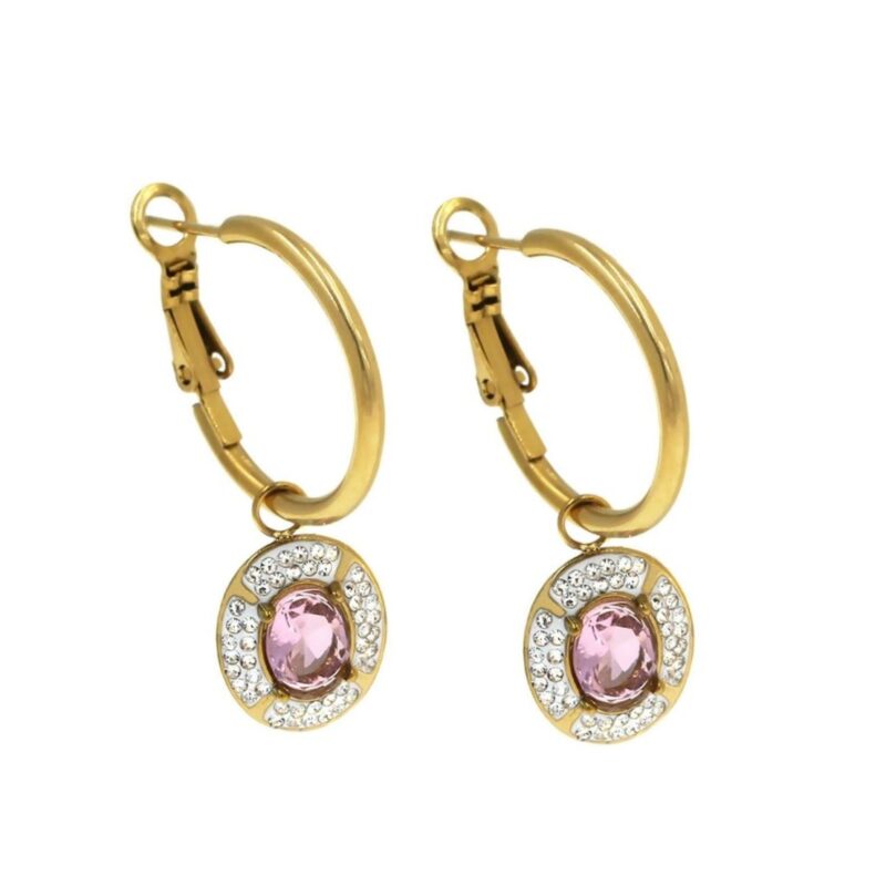 Σκουλαρίκια κρίκος ατσάλι με ροζέτα οβάλ ροζ ζιργκόν.