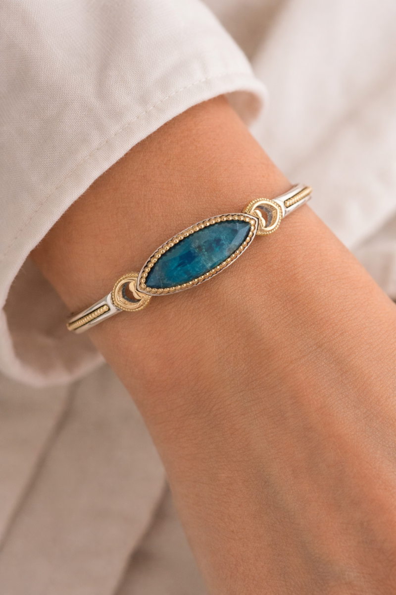 Ασημένιο Βυζαντινό βραχιόλι χειροπέδα, με ορυκτό απατίτη σε μπλε χρώμα και κρύσταλλο.